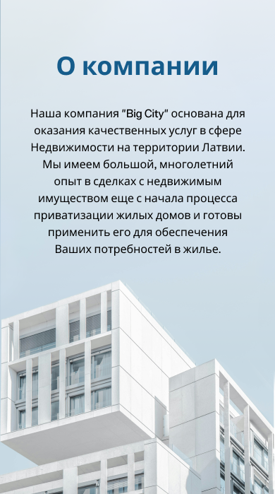 Mūsu kompānija " Big City" ir izveidota lai sniegtu kvalitatīvus pakalpojumus nekustāmo īpasumu sfērā Latvijas teritorijā. Mums ir liela pieredze darījumos ar nekustamiem īpasumiem vel no dzīvojamo māju privatizācijas procesa sākuma un mēs esam gatavi pielietot savu pieredzi lai nodrošinātu jūsu vajadzības pēc dzīvesvietas.